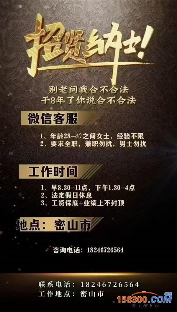 招聘微信客服,手机活,底薪+业绩工资不封顶,双休,法定假日休息,早上8.30-11点,下午1.30-4点,要求长期,女士。**勿扰,男生勿扰
